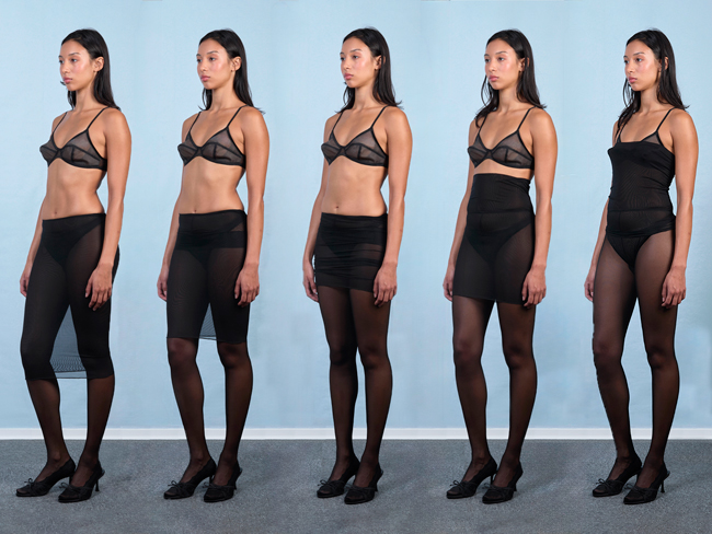 Cette première pièce, le collant-jupe, incarne parfaitement cette vision du vêtement hybride. Il associe un collant à une jupe intégrée et ajustable, permettant une multitude de silhouettes à porter longue, courte, froncée, en bustier ou en jumpsuit.