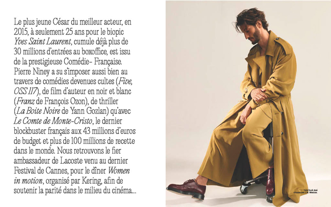 Le plus jeune César du meilleur acteur, en 2015, à seulement 25 ans pour le biopic Yves Saint Laurent, cumule déjà plus de 30 millions d’entrées au boxoffice, est issu de la prestigieuse Comédie- Française. Pierre Niney a su s’imposer aussi bien au travers de comédies devenues cultes (Five, OSS 117), de film d’auteur en noir et blanc (Franz de François Ozon), de thriller (La Boite Noire de Yann Gozlan) qu’avec Le Comte de Monte-Cristo, le dernier blockbuster français aux 43 millions d’euros de budget et plus de 100 millions de recette dans le monde. Nous retrouvons le fier ambassadeur de Lacoste venu au dernier Festival de Cannes, pour le dîner Women in motion, organisé par Kering, afin de soutenir la parité dans le milieu du cinéma…