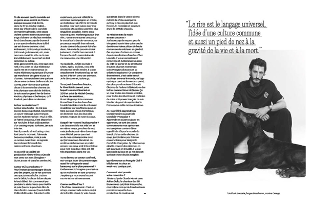 ou de faire rire mes potes. Depuis toujours, le rire est un ciment très fort dans mon groupe d’amis, avec mes potes d’enfance mais aussi avec mes potes du métier. Je pense que lorsque j’ai fait cette série Casting sur Canal +, qui fut assez confidentielle, c’était un véritable exutoire de tout ce qui nous faisait peur, comme peut l’être le jugement humain d’un entretien d’embauche ou d’un casting. Le rire c’est ce qui nous soude encore. En fait, d’une certaine manière, Casting est une série qui me ressemble beaucoup. Je m’en rends compte en vieillissant.