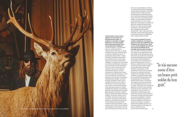 Oui, tout à fait. Comme je ne me suis rien interdit, je me suis retrouvé avec des musiques très différentes les unes des autres, qui avaient donc besoin de personnes spécifiques pour travailler sur chacune d’elles. SebastiAn et Oscar Holter en ont produit trois, et j’ai aussi collaboré avec Victor Le Masne ou Daniel Stricker sur d’autres : ce sont les chansons elles-mêmes qui ont défini avec qui je devais travailler. (LA SUITE ICI…)