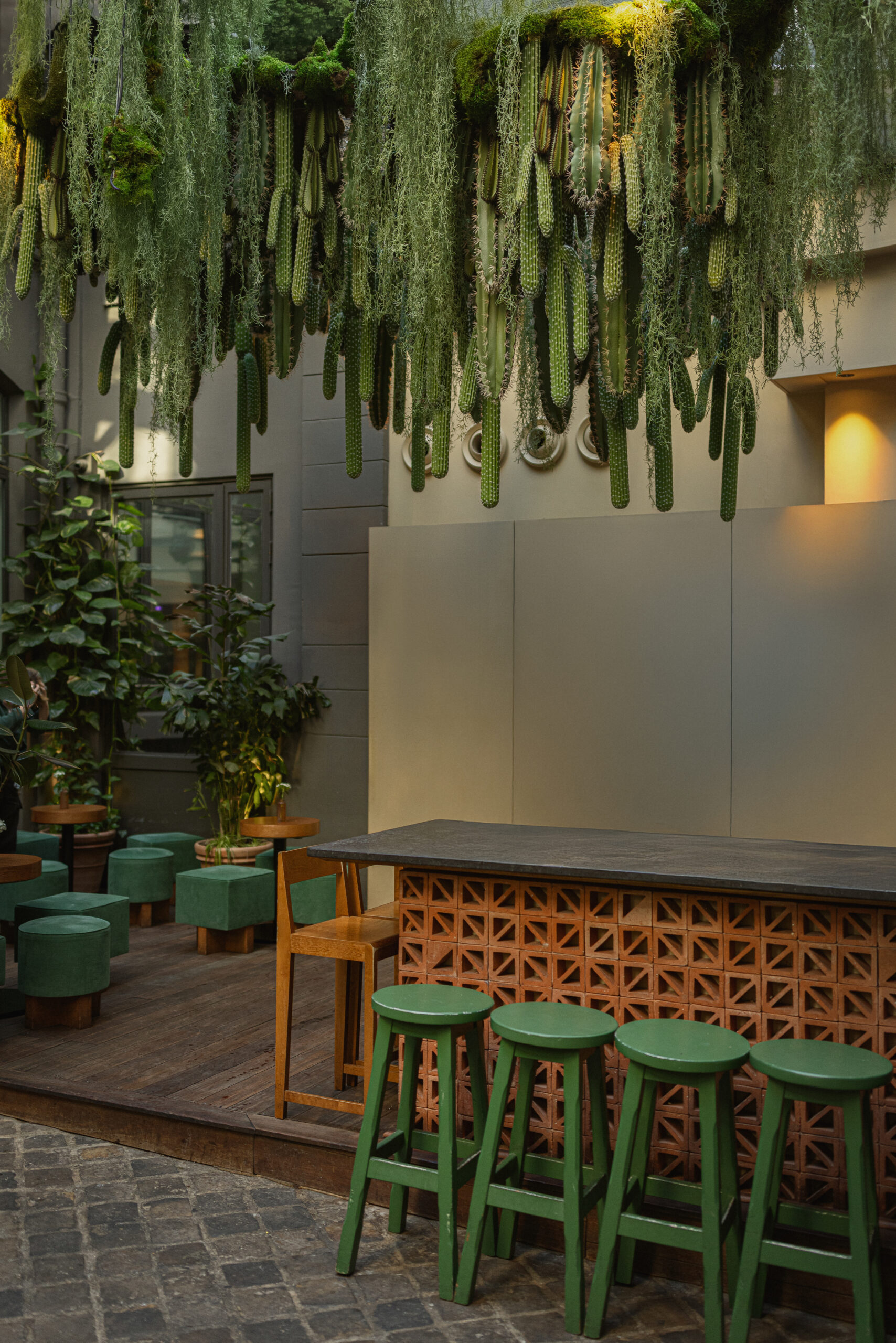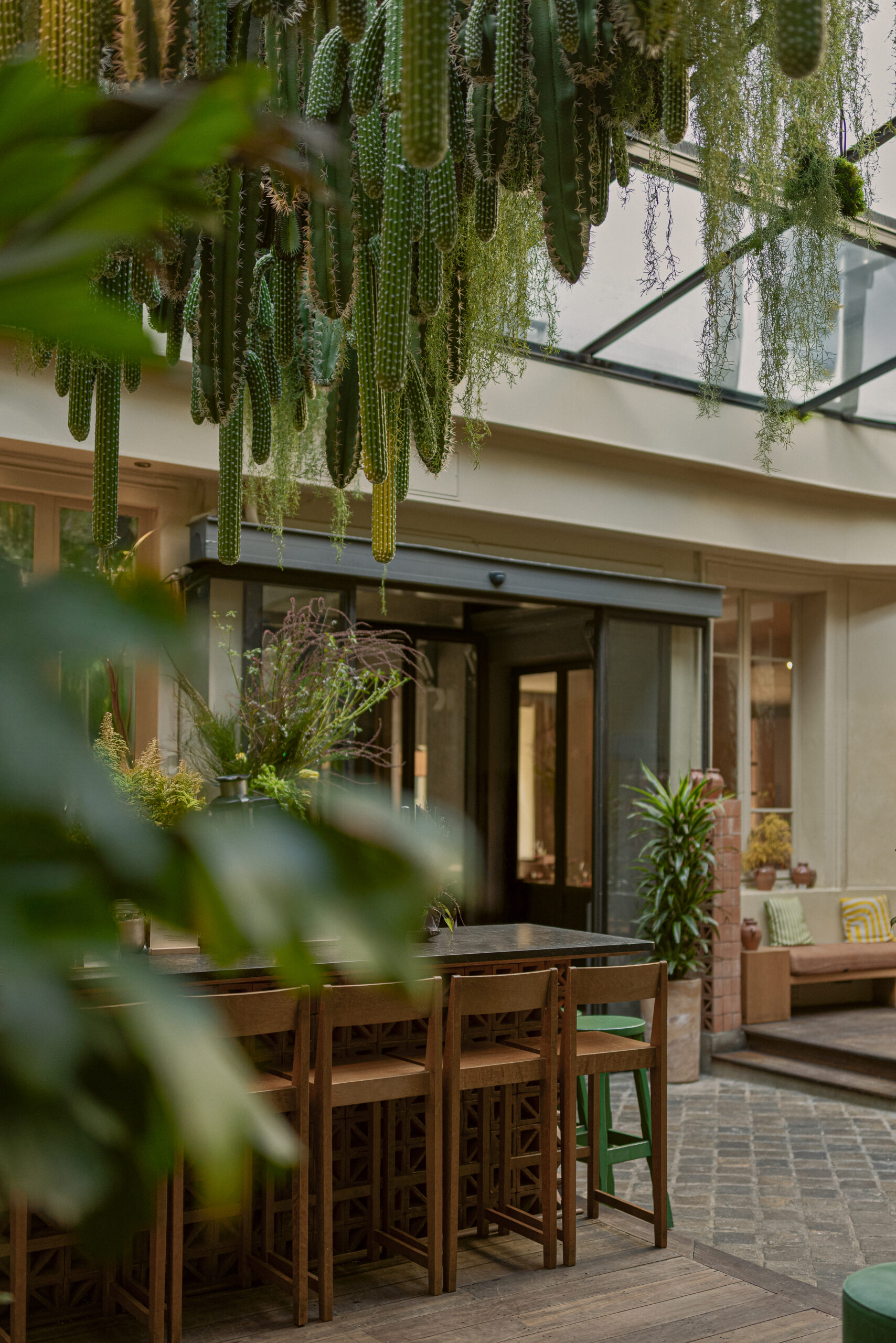 Deux accès, deux atmosphères. Côté club, la verrière capte le ciel et transforme l’espace en serre urbaine le jour, en bar végétal à la nuit tombée. Côté restaurant, la cuisine s’expose sans filtre. Flammes visibles, gestes francs, brigade en mouvement. Les assiettes ne surgissent pas en silence ; elles arrivent dans un ballet précis.
