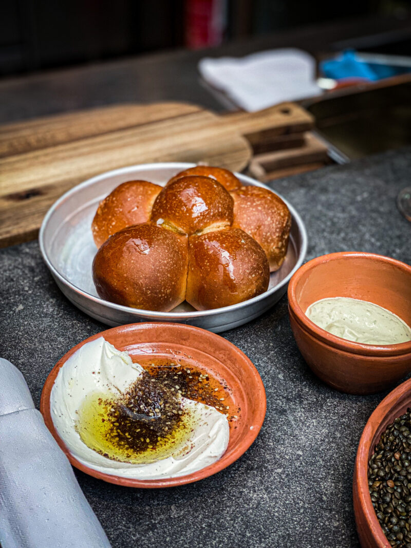 Dans le détail, la ligne est nette : végétarienne, saisonnière, inspirée par Jérusalem sans folklore. Autour, un paysage de mezze déroule tahini d’amandes, babagganoush, massabaha d’haricots blancs, légumes rôtis, pains chauds parfumés aux épices, au sumac, à l’origan. Cru, braise, fermentation, herbes fraîches : la cuisine jérusalémite s’exprime dans le dialogue entre héritage et modernité. Rien d’ornemental. Tout est pensé pour la sensation.